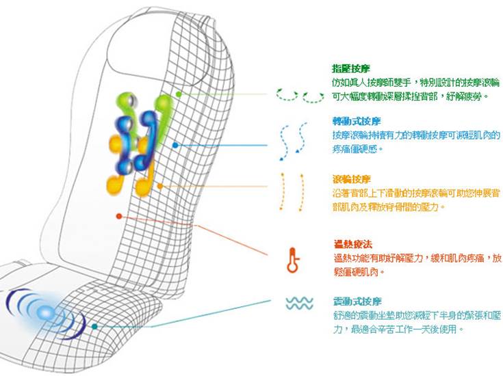 1.3項主要的按摩模式(指壓、轉動及滾輪)替您深層的背部舒緩享受,您亦